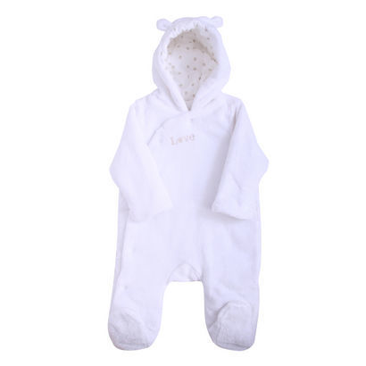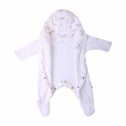 Bộ body dài tay, liền tất giúp giữ ấm cho bé, bé không bị cấn áo lên hay gió lùa vào phần bụng. Bộ body còn có mũ chùm đầu phía trên, giúp phần đầu của bé luôn được ấm áp.